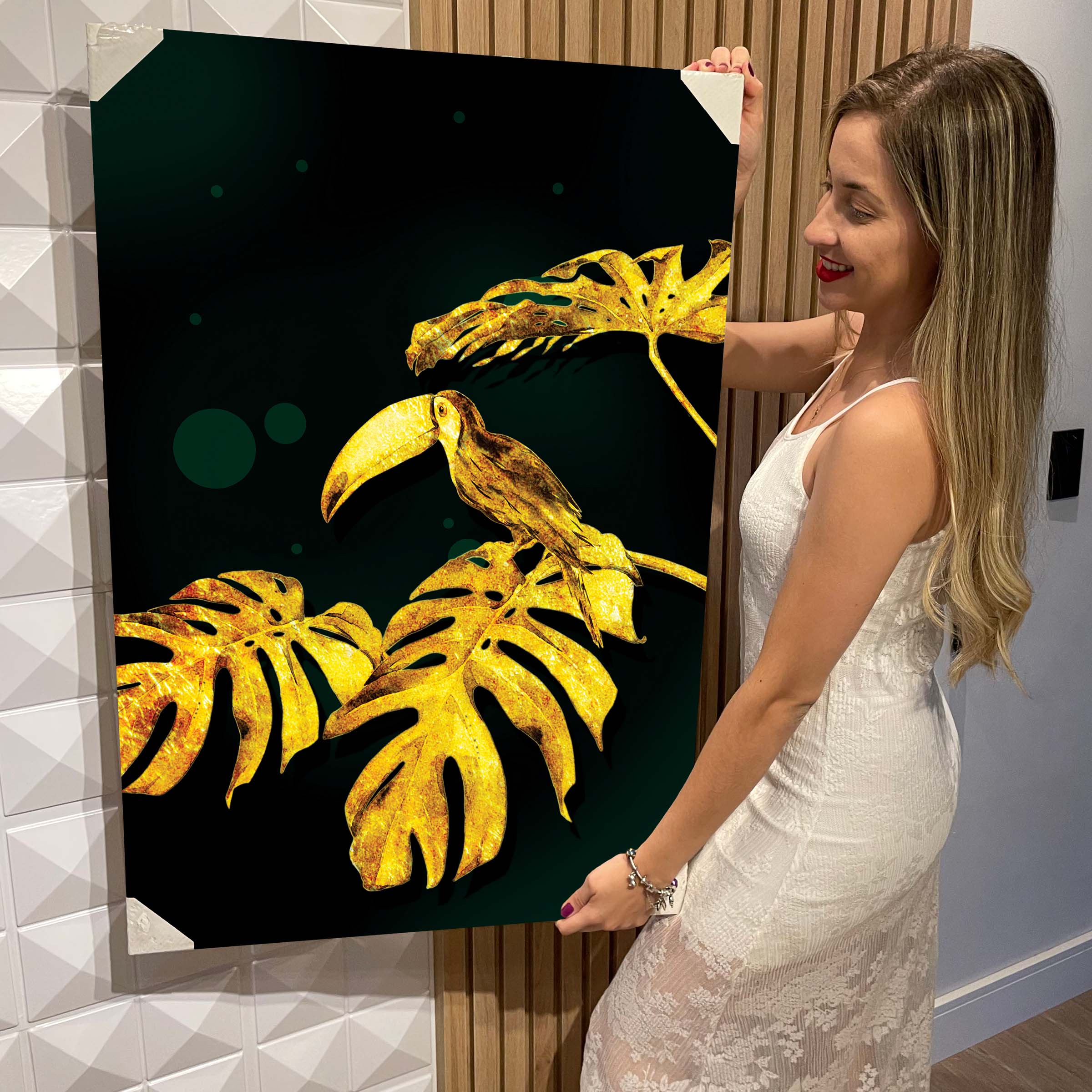 Quadro Decorativo Flutuante Botânico Costela de Adão e Tucano Dourado