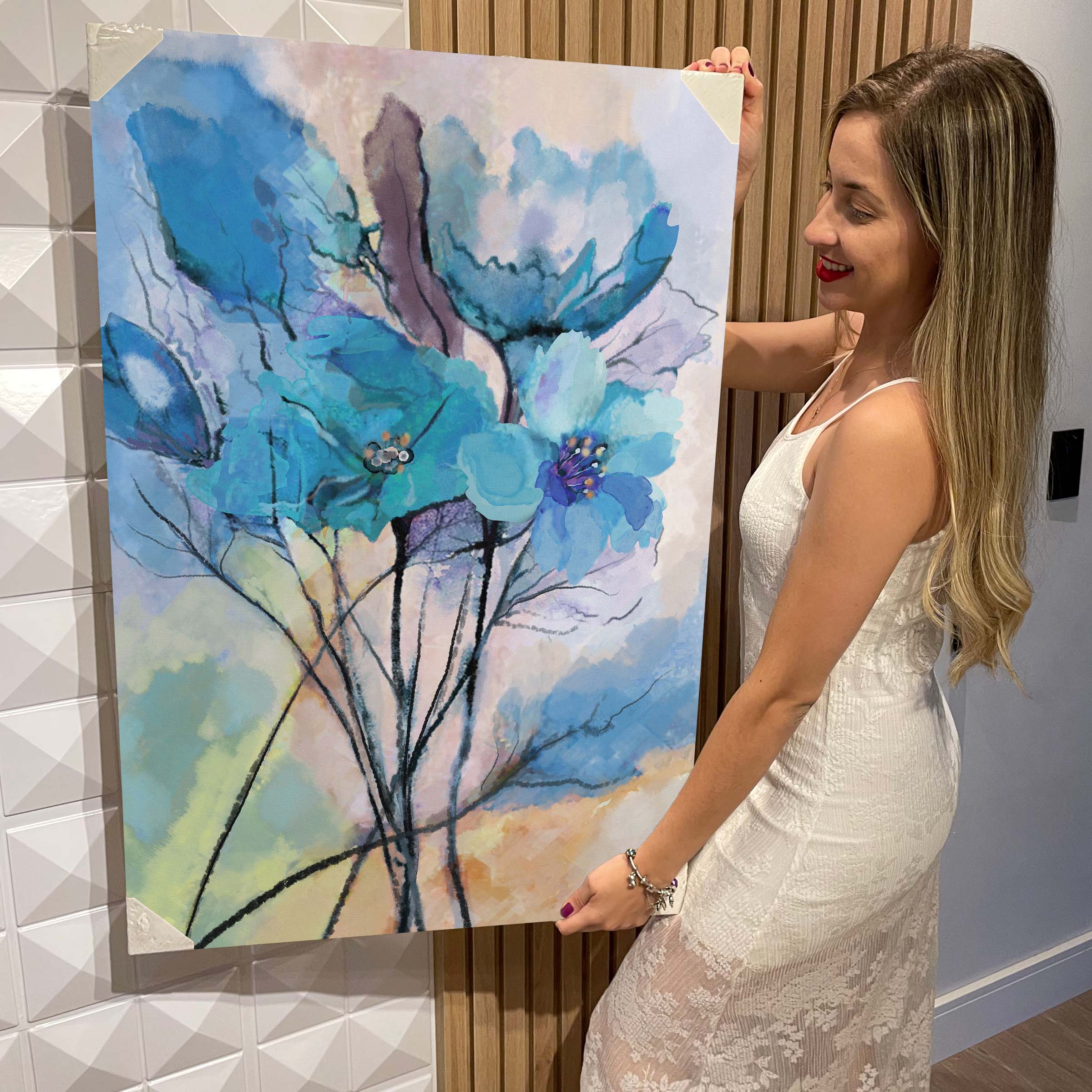 Quadro Decorativo Flutuante Floral Flores Azuis Pintura a Óleo Vertical