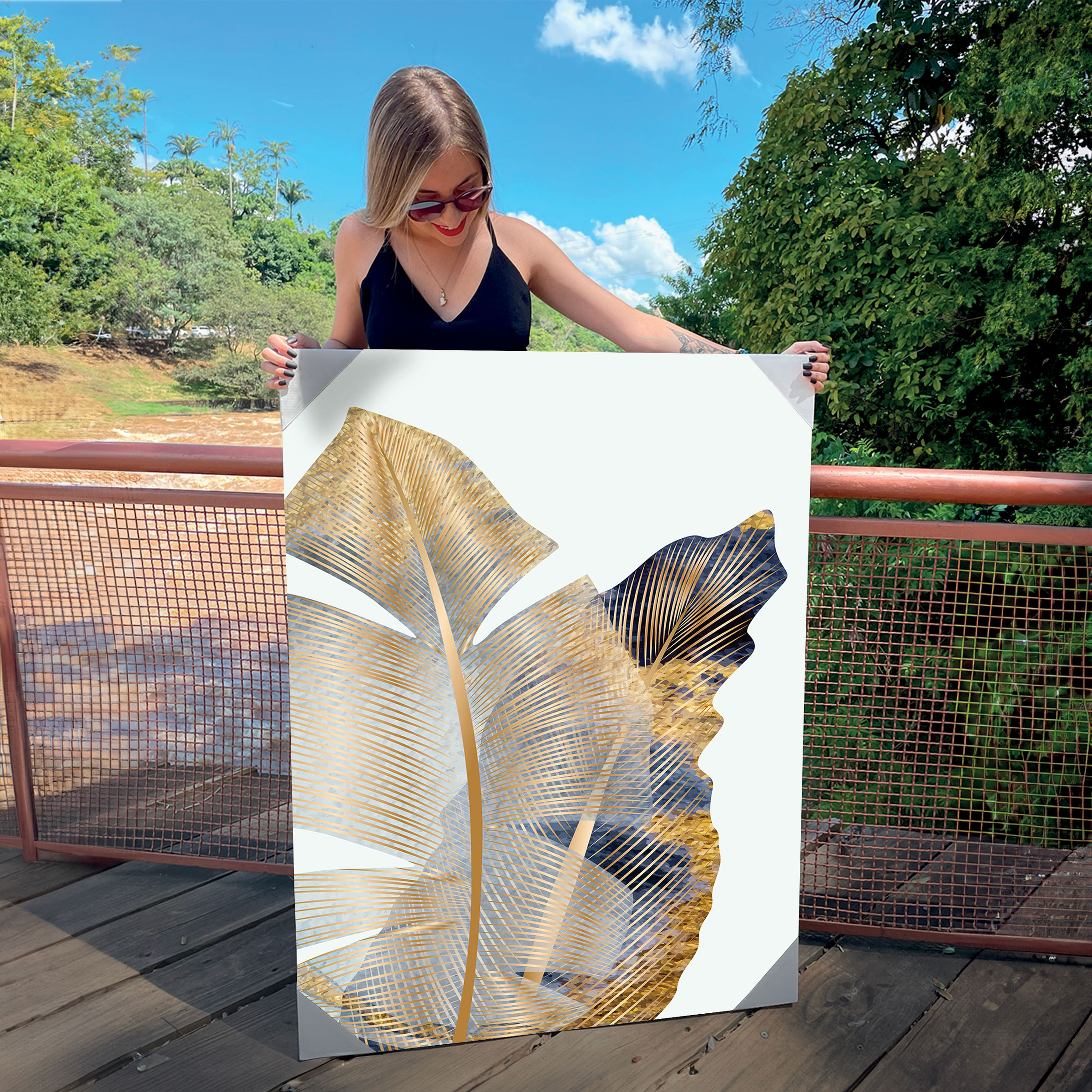 Quadro Decorativo Canvas Composição de Folhas Azuis com detalhes em Dourado Vertical