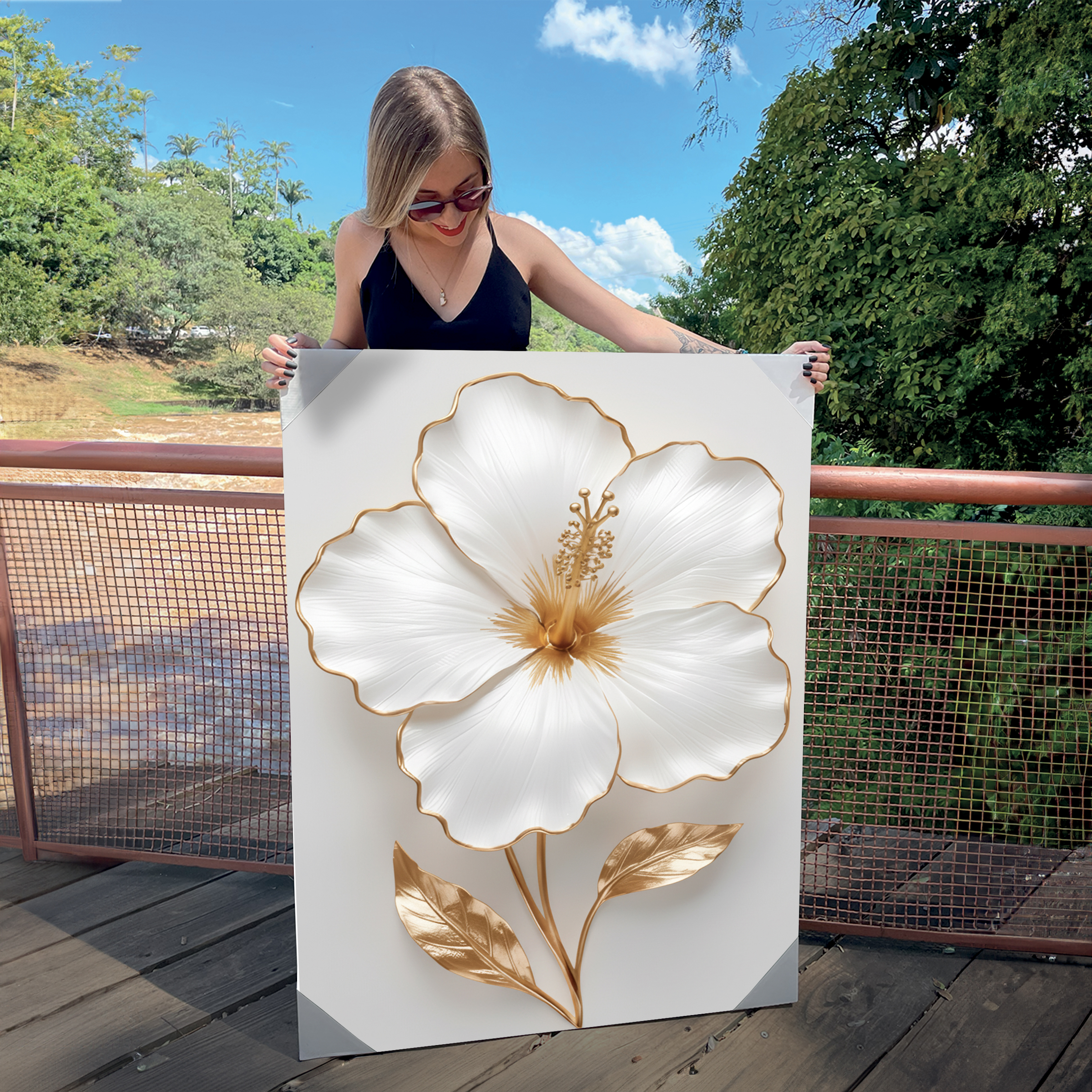 Quadro Decorativo Canvas Flor de Hibisco Branca e Dourada Luxo
