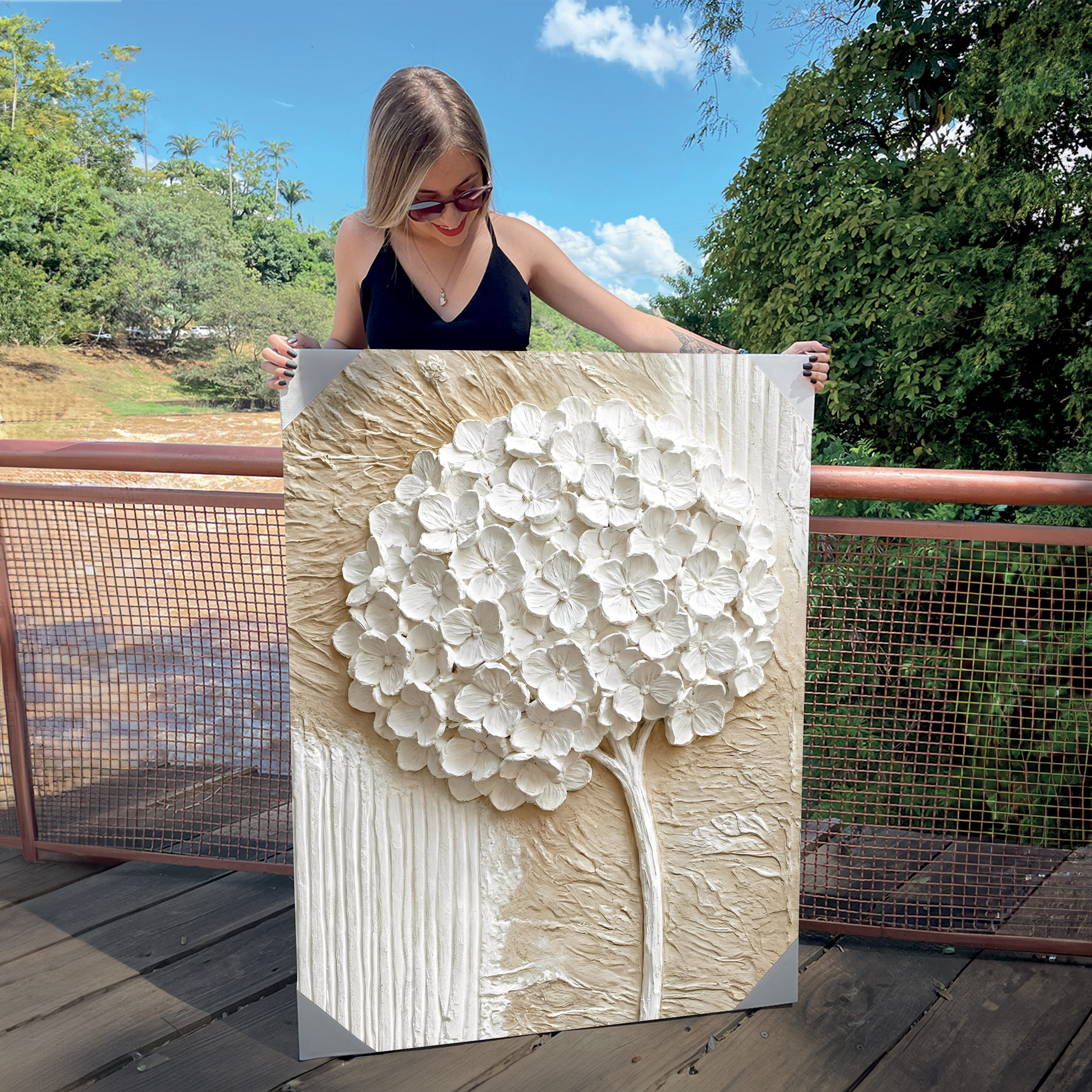 Quadro Decorativo Canvas Floral Abstrato Branco Hortência Vertical