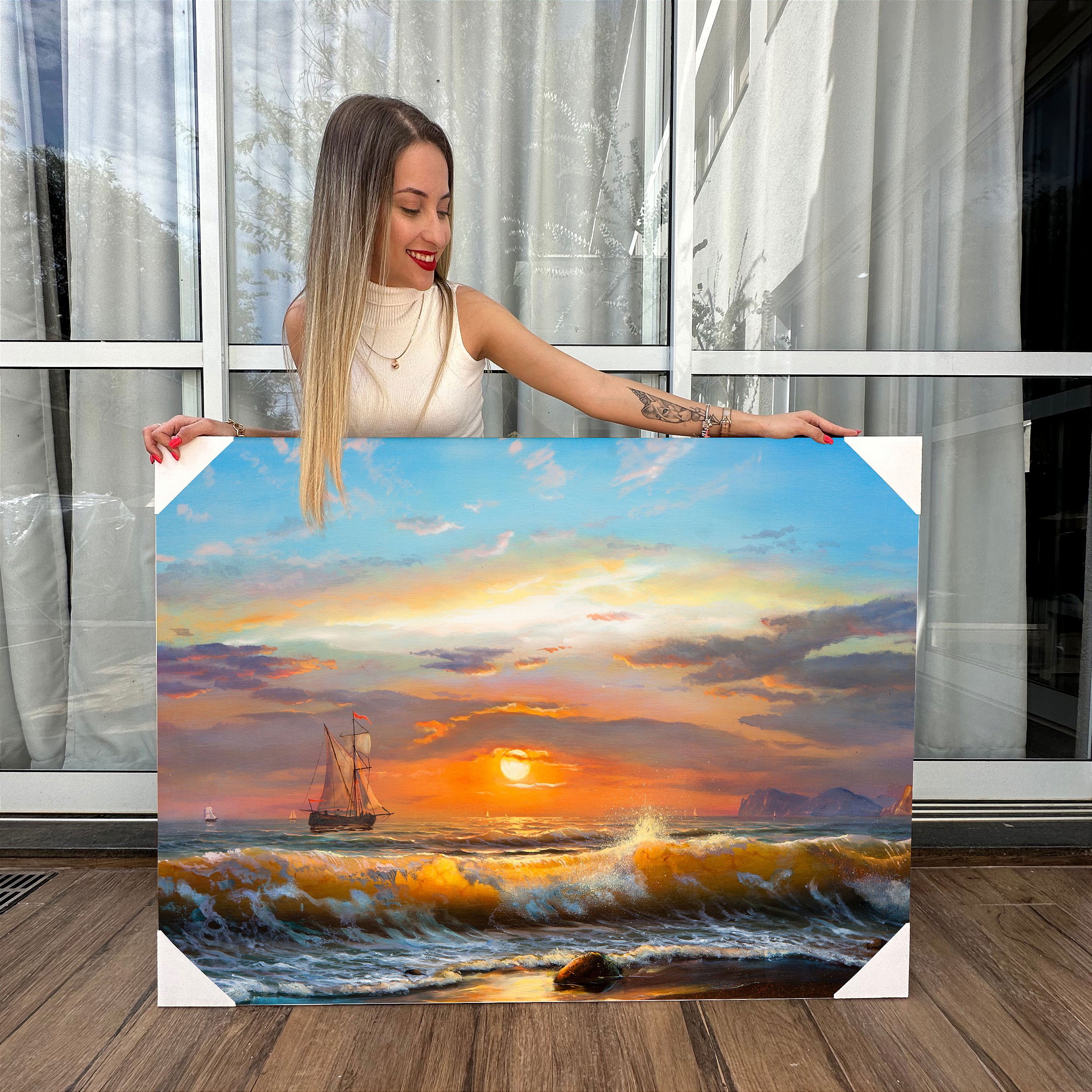 Quadro Decorativo Canvas Paisagem Pintura a Óleo Barco navegando ao mar sob Por do Sol Horizontal