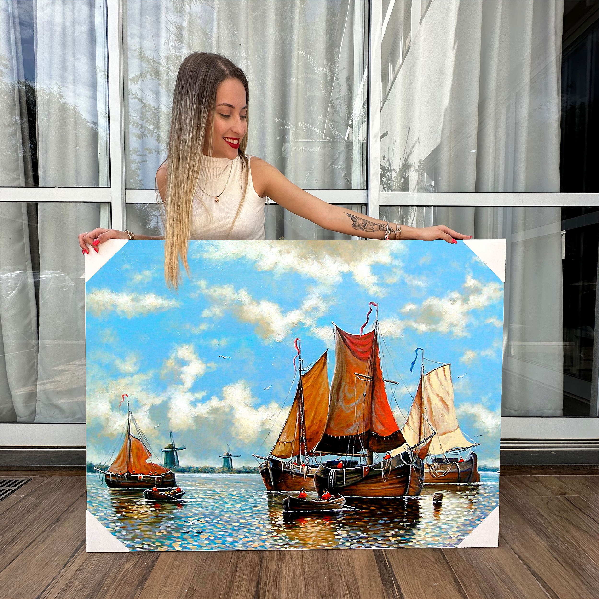 Quadro Decorativo Canvas Paisagem Pintura à Óleo Barcos a Vela Horizontal