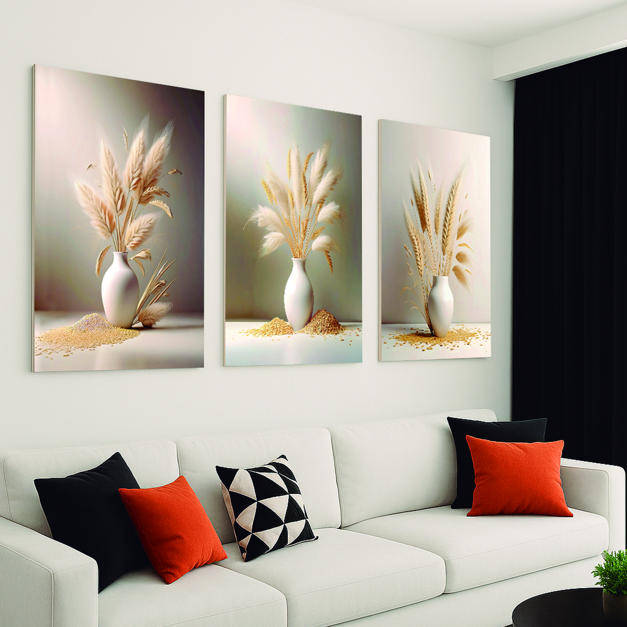 Quadro Decorativo Trio em Canvas Vasos com Capim dos Pampas