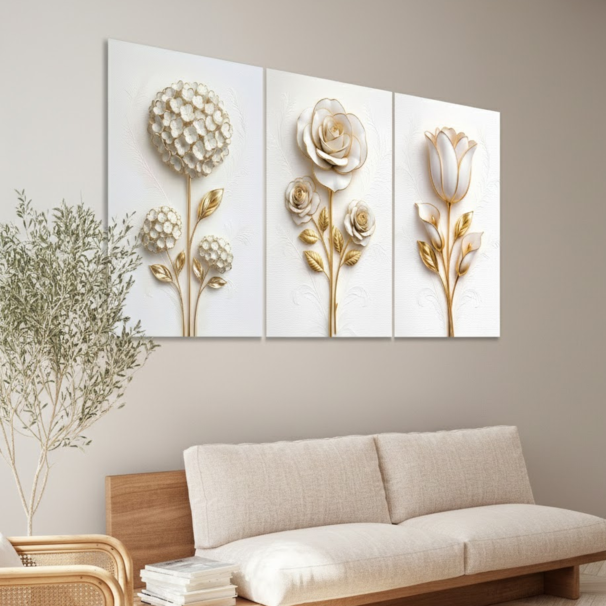 Quadro Decorativo Trio Floral Branco e Dourado Luxo
